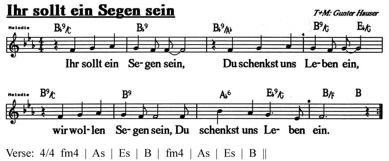 Refr.: Ihr sollt ein Segen sein Du schenkst uns Leben ein Wir wollen Segen sein Du schenkst uns Leben ein 1. Glauben bezeugen und miteinander reden Einheit suchen, in Vielfalt einander begegnen Menschenwürde achten, Freiheit erhalten Verantwortlich handeln und die Welt gestalten 2. Aufbruch wagen und miteinander feiern Wahrheit sagen und Glauben jetzt erneuern Gemeinsamkeit leben, einander achten Tradition bewahren und nach Neuem trachten Alternative Verse: 3. Glauben leben und füreinander einstehen Neuem begegnen und aufeinander zugehen Den anderen achten, die Freiheit erhalten Handeln wie Jesus und die Welt gestalten 4. Vielfalt verstehen und miteinander feiern Sagen was wahr ist und Leben erneuern Gemeinsamkeit leben, einander ansehen Gutes bewahren und einfach mal losgehen T: Maria & Gunter Hauser / M: Gunter Hauser / GEMA |